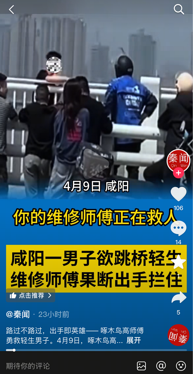 咸阳桥勇救轻生者,啄木鸟维修师傅获激励金,平台奖励制度暖人心